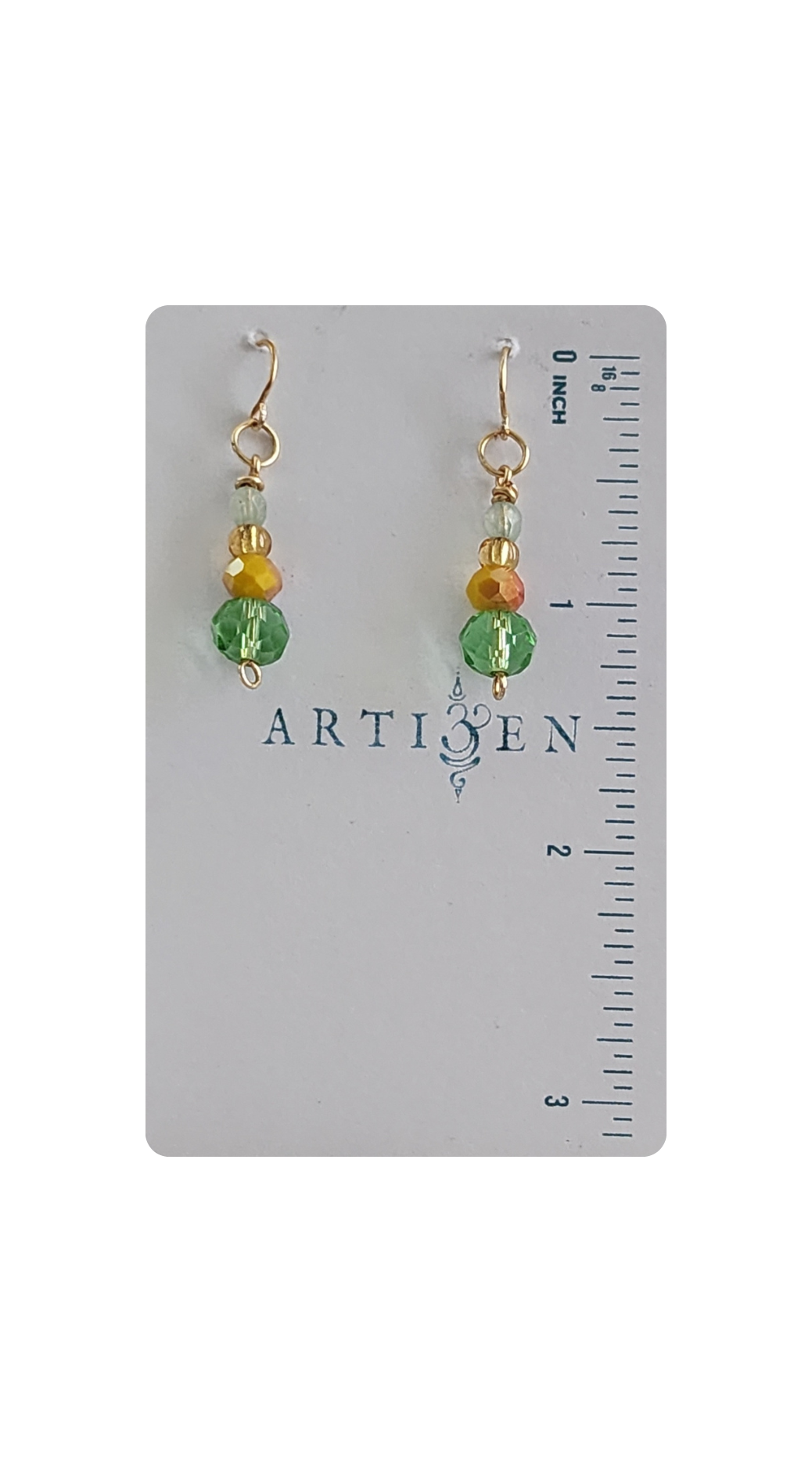 These earrings feature a vertical stack of colorful beads dangling from hand-formed gold-tone wire French hooks. The combination of sparkling, faceted crystals with the more organic, earthy-toned bead gives the earrings a bohemian, nature-inspired aesthetic. They are elegant yet understated.