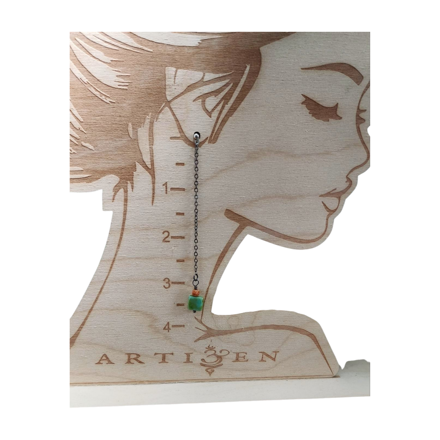 The long dark chain and shoulder-grazing design create a statement piece, while the rustic turquoise glass square and Czech Picasso bead accent add a touch of bohemian charm. Completed with 3mm silver-tone ball posts for a sophisticated look.