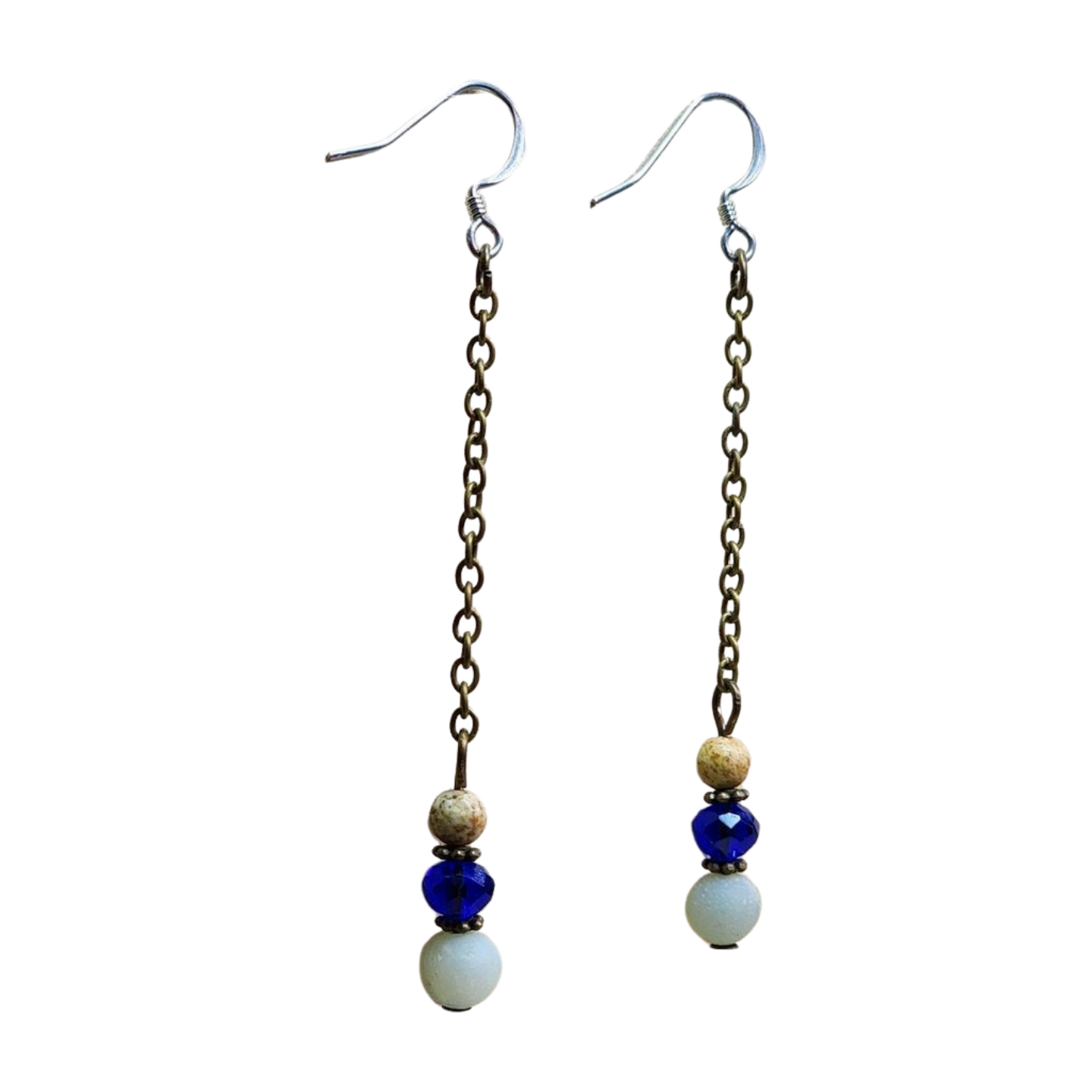 'Noche Bohemia' earrings feature silver-toned hooks, vintage bronze-tone chain, jasper, sapphire blue faceted glass, and matte amazonite beads. These unique components come together to create a romantic, bohemian-inspired piece that adds a touch of vintage flair to any outfit.